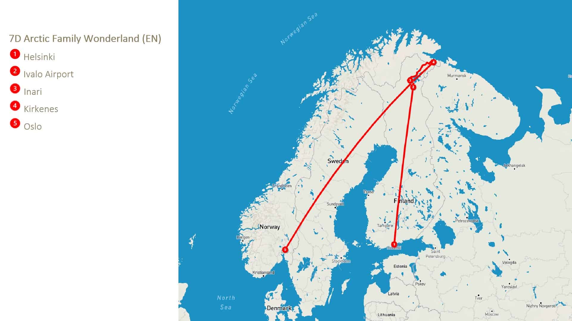 Helsinki, Inari, Kirkenes, Oslo