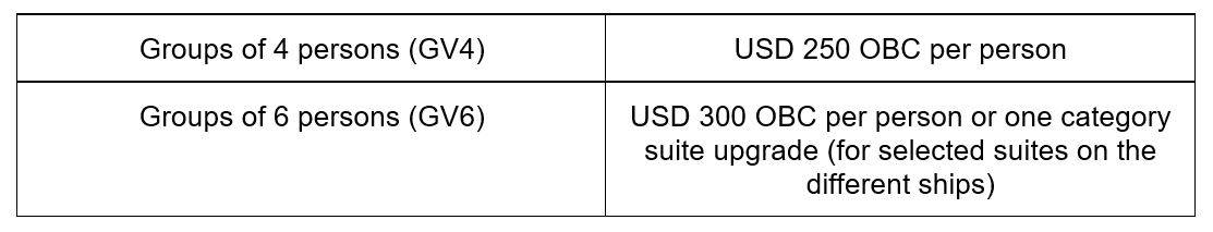 Enjoy up to USD300 onboard credits per person, or one-category suite upgrade (for selected cabins on different ships), when you travel in the group of 4 to 6 persons on selected voyages. For more details & the applicable sailings, please speak to our luxury travel specialists.